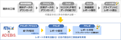 日次でアドエビスの計測データと媒体データの自動取得・紐づけ集計を簡単に行うことができるようになり、大幅なレポート作成時間を削減することができます!