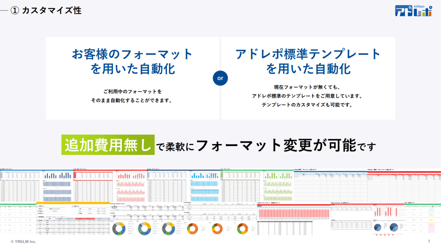 アドレポのテンプレートはもちろん、ご利用中のフォーマットもそのまま自動化することができます。カスタマイズは追加費用無しで、柔軟に変更が可能です。